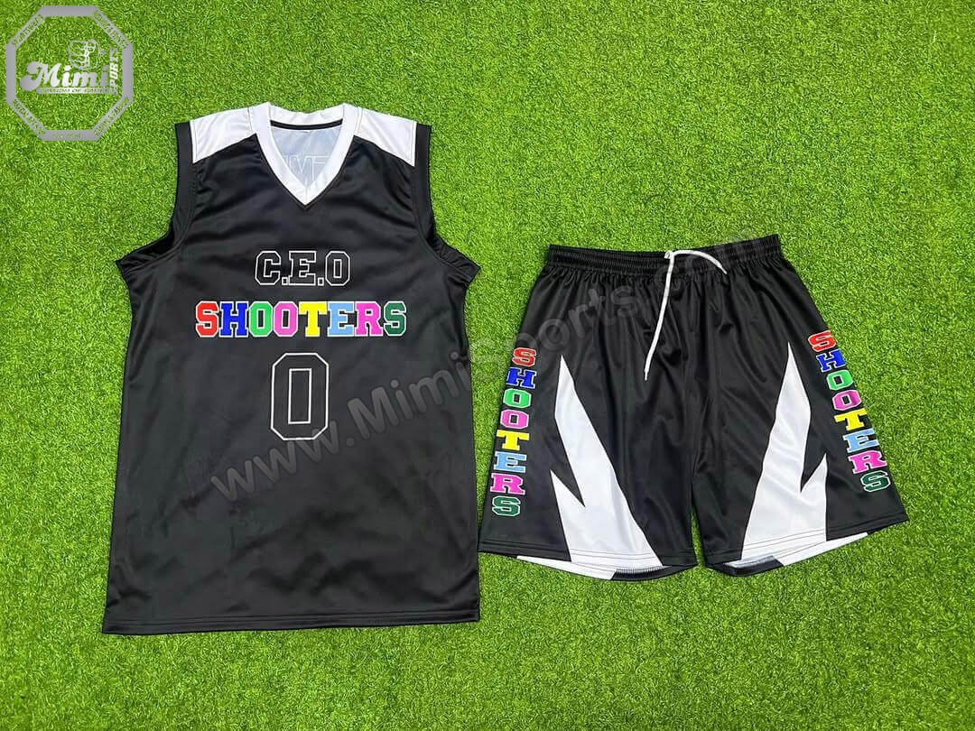 Make your team unstoppable with MimiSports’ Elite Black C.E.O SHOOTERS Basketball Uniform — engineered for performance, pride, and bold visual impact.