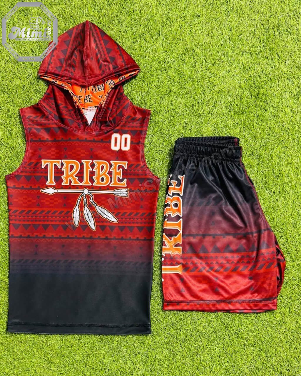 Upgrade your team’s identity with the Custom Sleeveless Hooded Football Uniform — a bold fusion of cultural pride, athletic performance, and premium craftsmanship. Designed by Mimi Sports USA in Phoenix, AZ, this red and black tribal-themed uniform is perfect for teams that want to stand out on the field with style and strength.