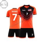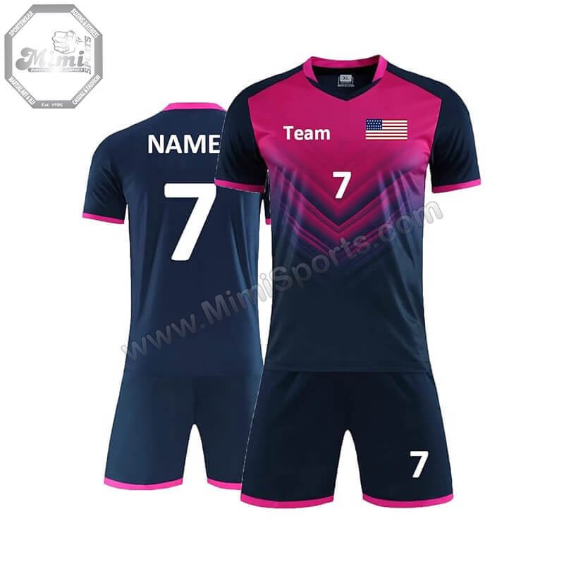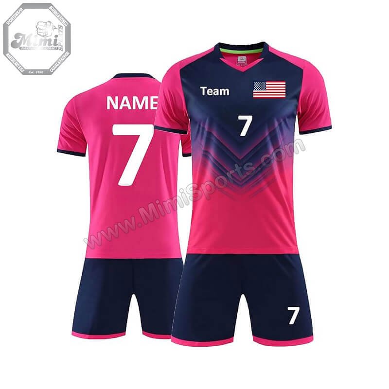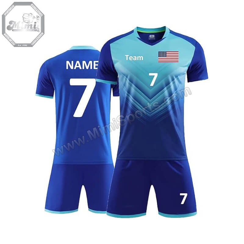 Step onto the field with confidence and style in the Custom Soccer Uniform Set by MimiSports USA, designed for performance, team identity, and visual impact. This sleek set includes a short-sleeve jersey and matching shorts, featuring a bold gradient chevron pattern, USA flag emblem, and player number 7—perfect for youth teams, academies, and custom club kits.