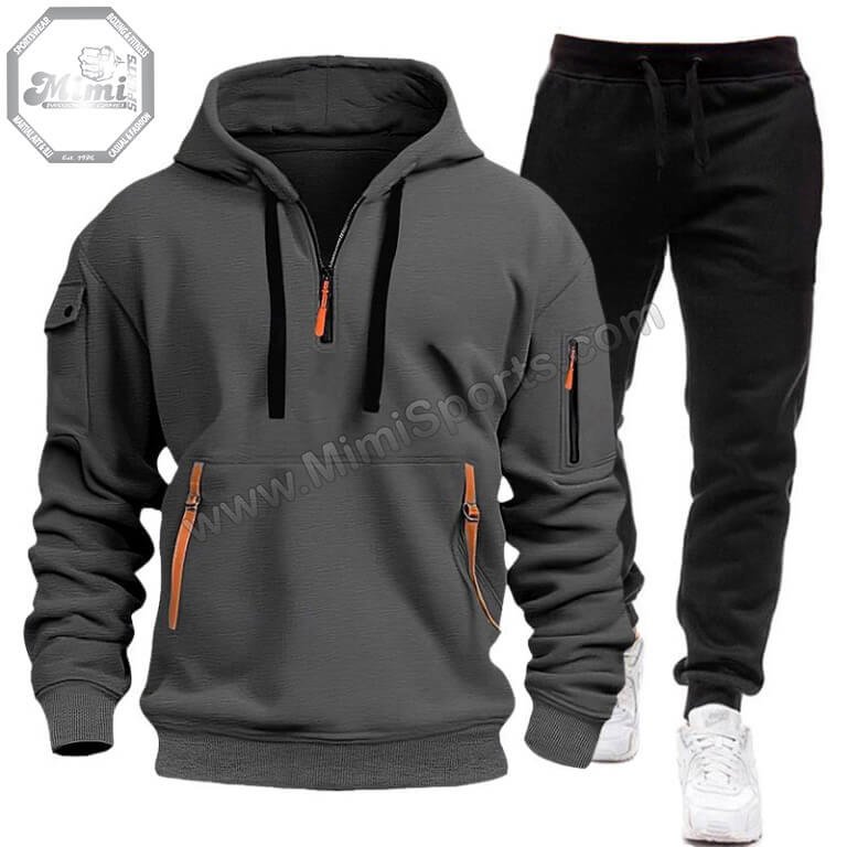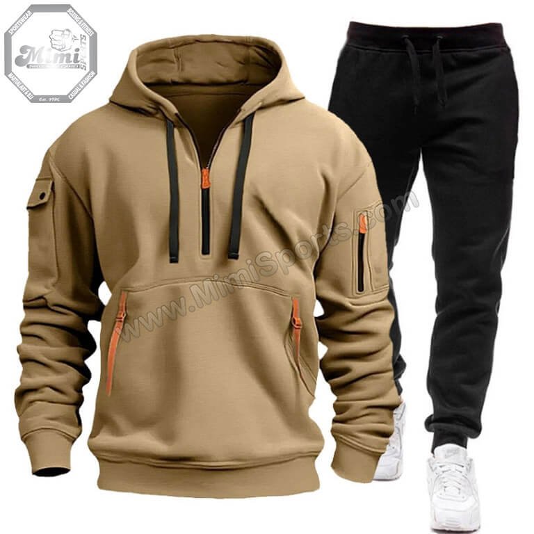 Upgrade your off-duty style with the Multi-Pocket Streetwear Hoodie & Jogger Set, designed for comfort, function, and urban edge. Featuring a half-zip hoodie with bold orange zipper accents and utility-style sleeve pockets, paired with tapered black joggers, this two-piece set is perfect for casual outings, gym sessions, or laid-back weekends. Available in navy blue, charcoal gray, and tan, itβs part of the MimiSports USA Utility Series, where fashion meets function.